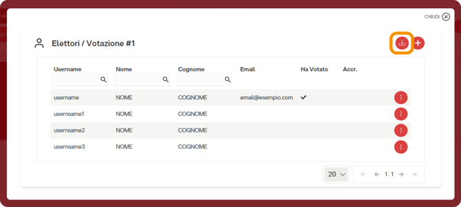 - Al momento dell'inserimento degli elettori, se si tratta degli stessi della votazione precedente, è necessario utilizzare lo stesso file excel utilizzato nel caricamento elettori della prima votazione. Per semplicità, è possibile scaricare nuovamente l'elenco direttamente dalla prima scheda di voto, e poi ricaricarlo nella seconda:
