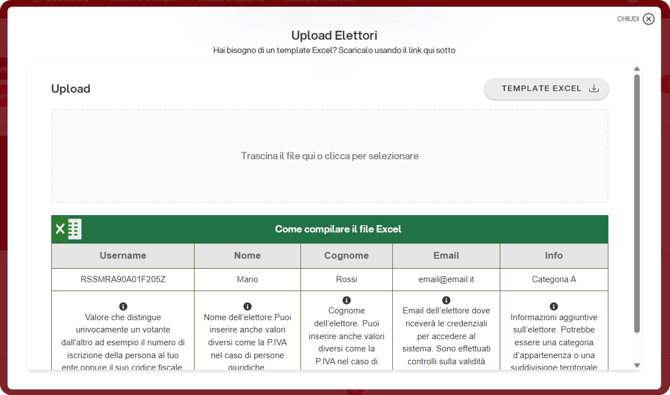 STEP 3: trascinare o selezionare il file appena scaricato nel box di caricamento elettori:
