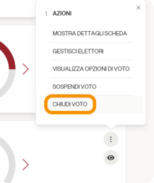 Per sospendere o chiudere la votazione, si clicca la stessa icona, e poi si clicca su "sospendi voto", oppure su "chiudi voto" per procedere direttamente con gli scrutini: