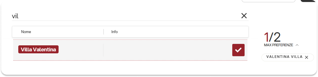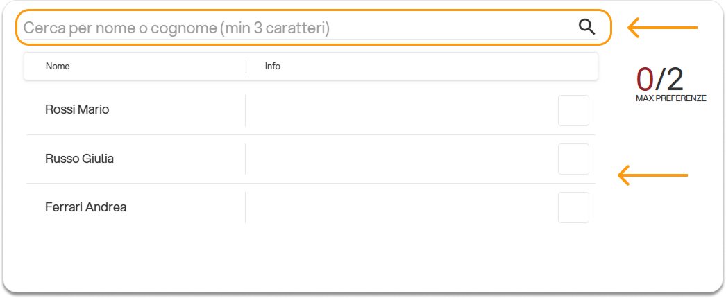 Inserendo almeno 3 caratteri del nome o cognome di uno degli eleggibili nella barra, l'elettore potrà visualizzare chi presenta quei caratteri nel nominativo e selezionare una preferenza: