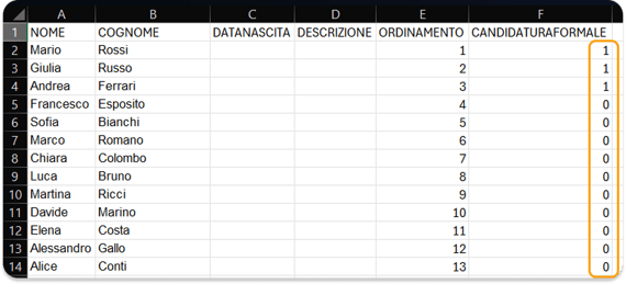 Compilare il file Excel dei candidati inserendo tutti i dati richiesti. Alla voce "Candidatura formale" inserire 1 se il candidato deve essere visibile in elenco e 0 per gli eleggibili non visibili.