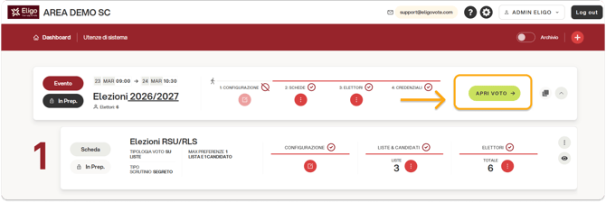 In questo caso sarà necessario cliccare sul tasto "Apri voto" a destra nel pannello dell'Evento elettorale. Questa operazione aprirà tutte le votazioni presenti all'interno di un evento elettorale: