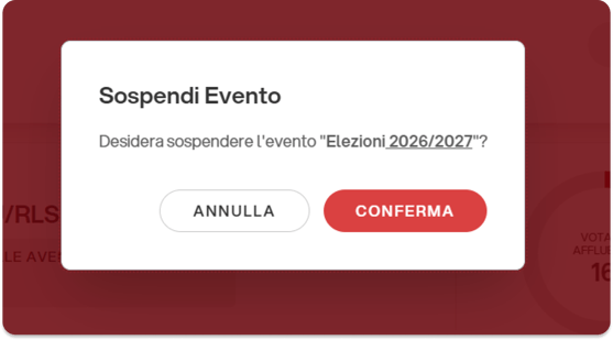 Per sospendere una votazione, quindi, basta cliccare sul tasto "Sospendi". Questa operazione inibirà la possibilità di esprimere il voto per un arco di tempo limitato (ad esempio se è previsto il voto solo in determinate fasce orarie) con la possibilità di riprendere regolarmente le votazioni quando lo si ritiene opportuno.
