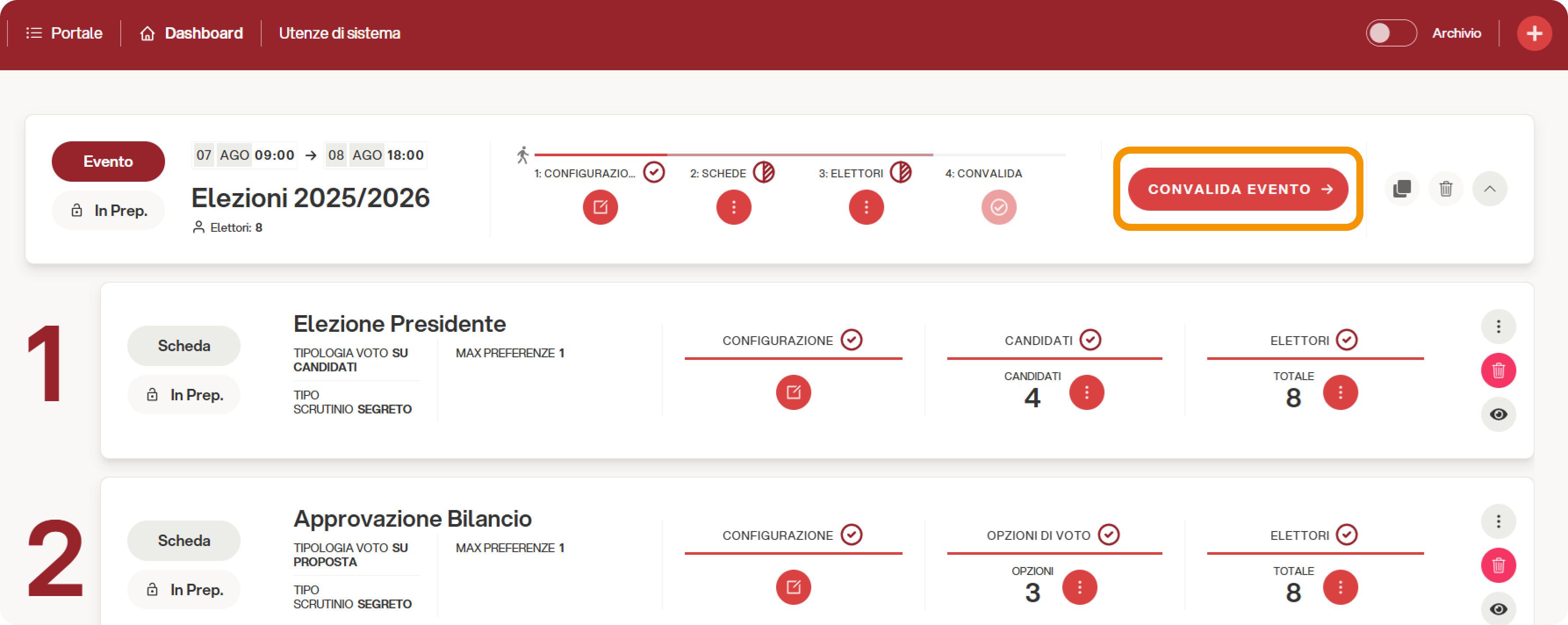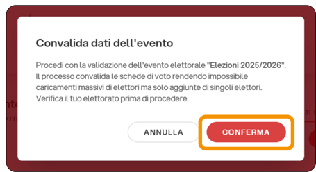 Dopo aver convalidato un evento, non sarà più possibile modificare le configurazioni dell'evento, caricare massivamente elettori né rimuoverli, pertanto, ci sono degli accorgimenti da prendere in fase preliminare che aiutano il corretto svolgimento delle votazioni.