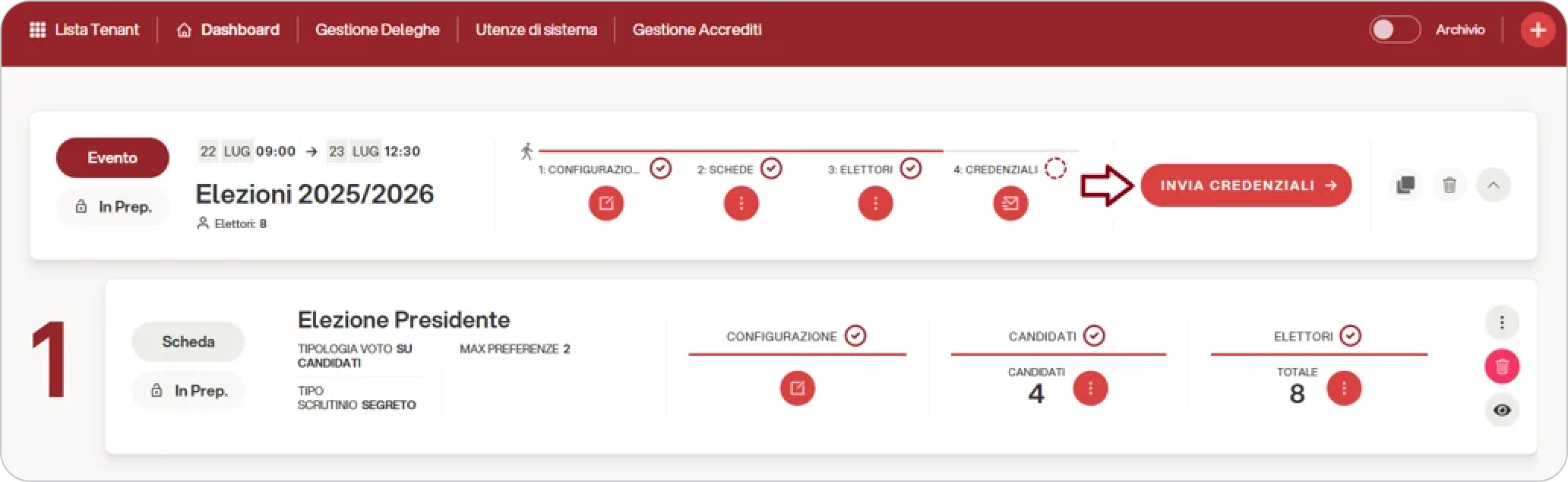 Dopo aver completato la configurazione di un evento elettorale, il passaggio finale prima dell'apertura è la convalida dell'evento elettorale che, generalmente, coincide con l'invio delle credenziali di voto come spiegato nel dettaglio in questo articolo.