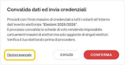 - Non inviare niente: Il sistema convaliderà l'evento senza inviare nulla agli elettori. Se si seleziona questa opzione, non sarà più possibile inviare massivamente le credenziali per quell'evento.