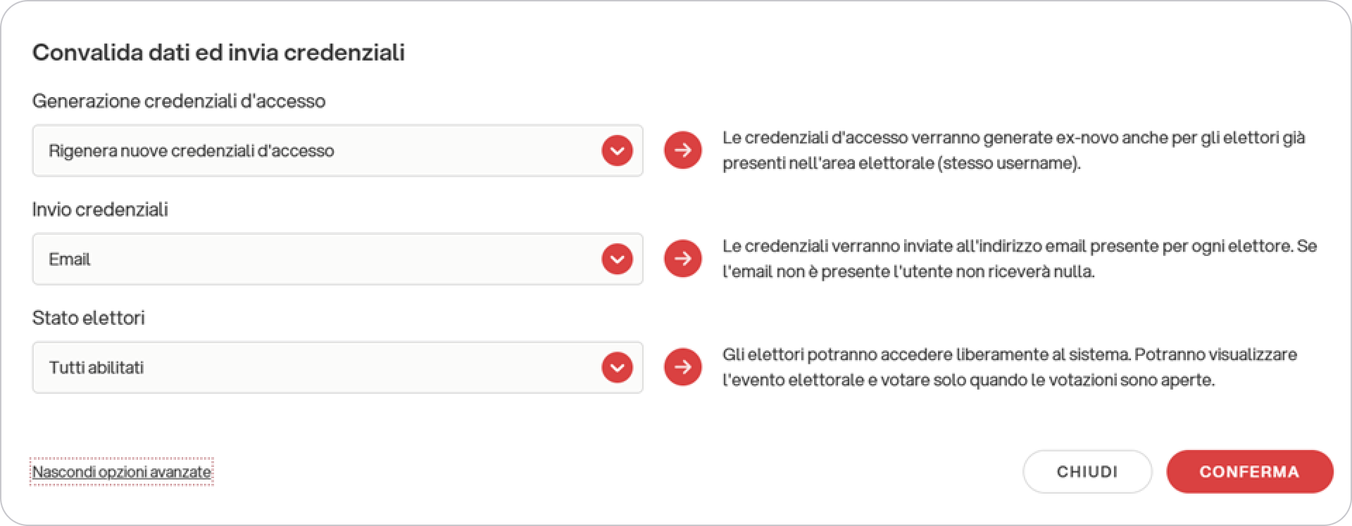 - Email: Le credenziali verranno inviate all'indirizzo email presente per ogni elettore. Se l'email non è presente l'utente non riceverà nulla;