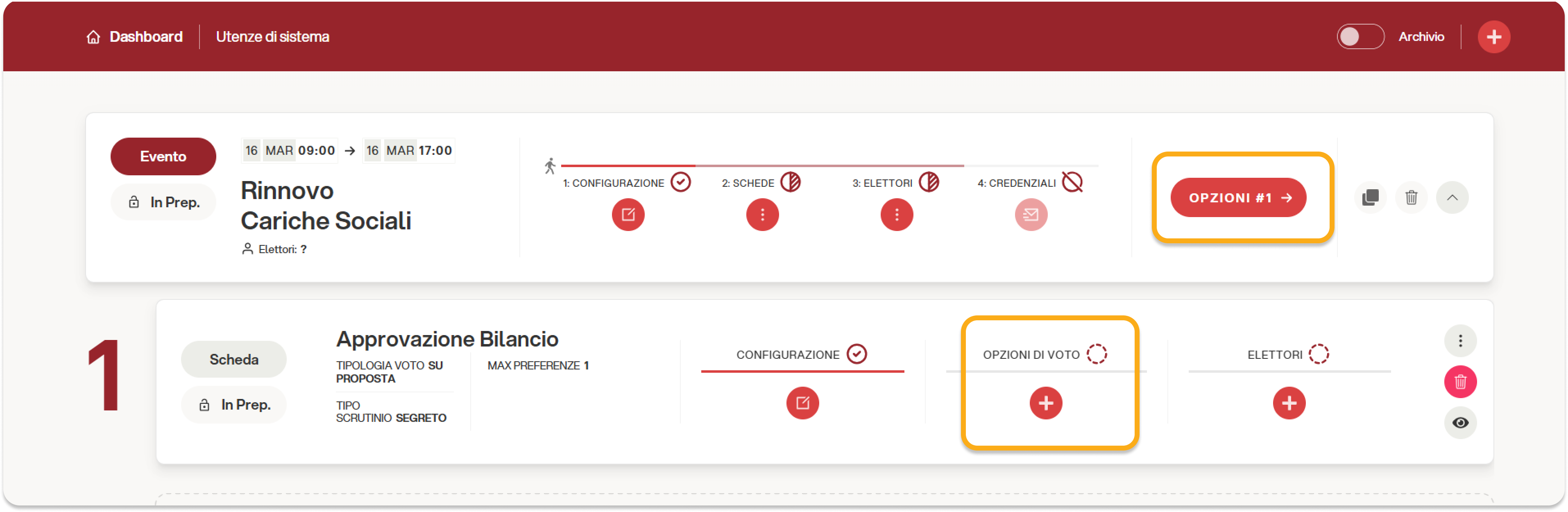 Dalla dashboard del tenant è possibile aggiungere opzioni a scheda di voto su proposta cliccando indistintamente il bottone "+ Opzioni di Voto" nella sezione di riepilogo della scheda di voto oppure il bottone "Opzioni #1", se presente, a destra della sezione di riepilogo dell'evento elettorale di riferimento:
