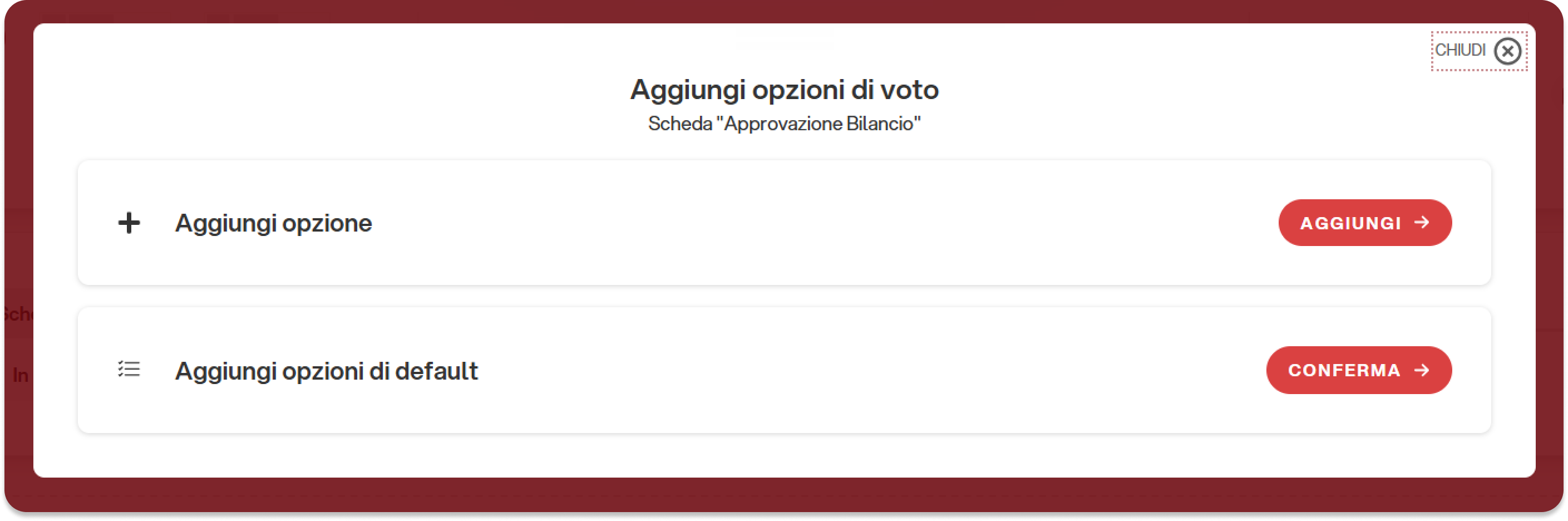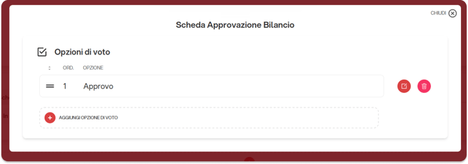 Una volta premuto uno dei pulsanti, si aprirà la finestra di inserimento opzioni, da cui sarà possibile scegliere se inserire opzioni personalizzate manualmente ("Aggiungi opzione") o quelle di default (Favorevole, Contrario, Astenuto):