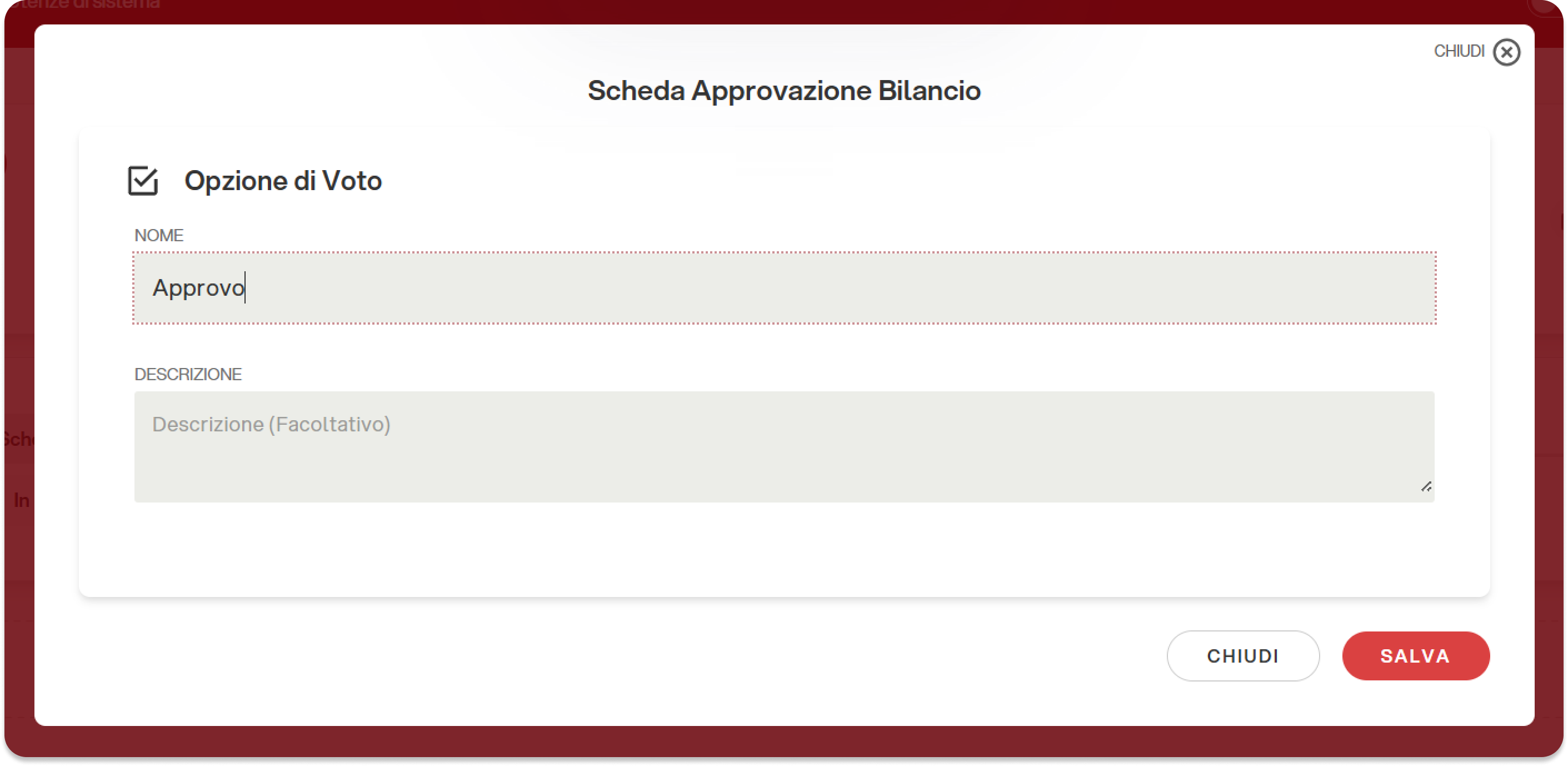 Nella finestra di inserimento manuale di opzioni di voto, dovrà essere inserito obbligatoriamente il Nome dell'opzione e potrà essere inserita una breve descrizione facoltativa.
