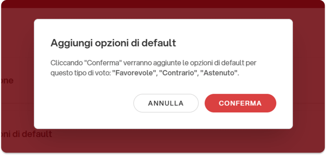Scegliendo questa voce, il sistema chiederà conferma dell'inserimento delle 3 opzioni di default (Favorevole, Contrario, Astenuto):
