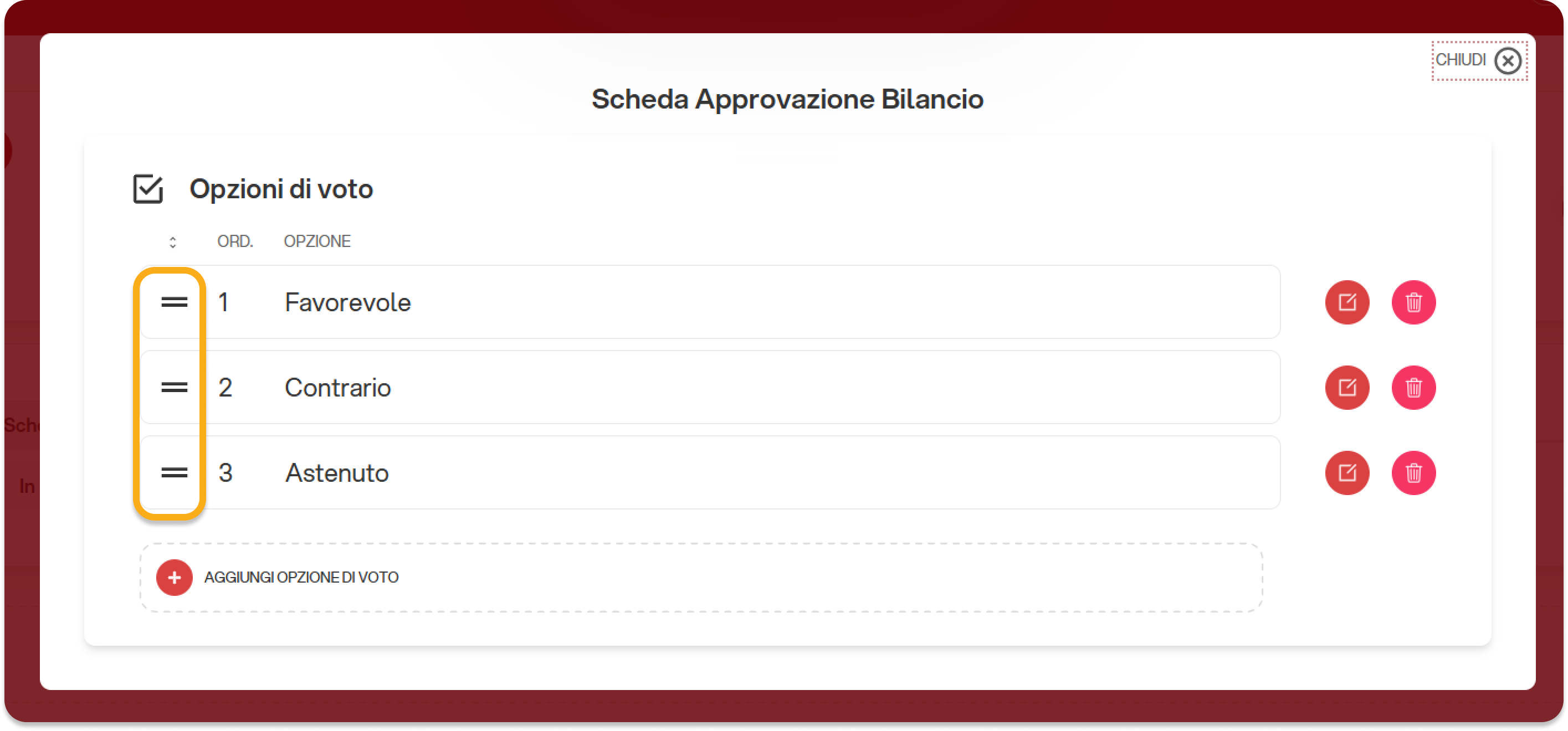 Per modificarne l'ordine, dalla finestra delle opzioni di voto, cliccare sul simbolo = e trascinare le opzioni nelle posizioni desiderate.