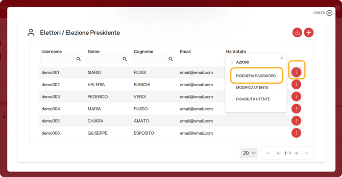 a destra dell'elettore che ha bisogno di nuove credenziali. Verrà aperto un menù a tendina con varie opzioni. Selezionare "Rigenera password".