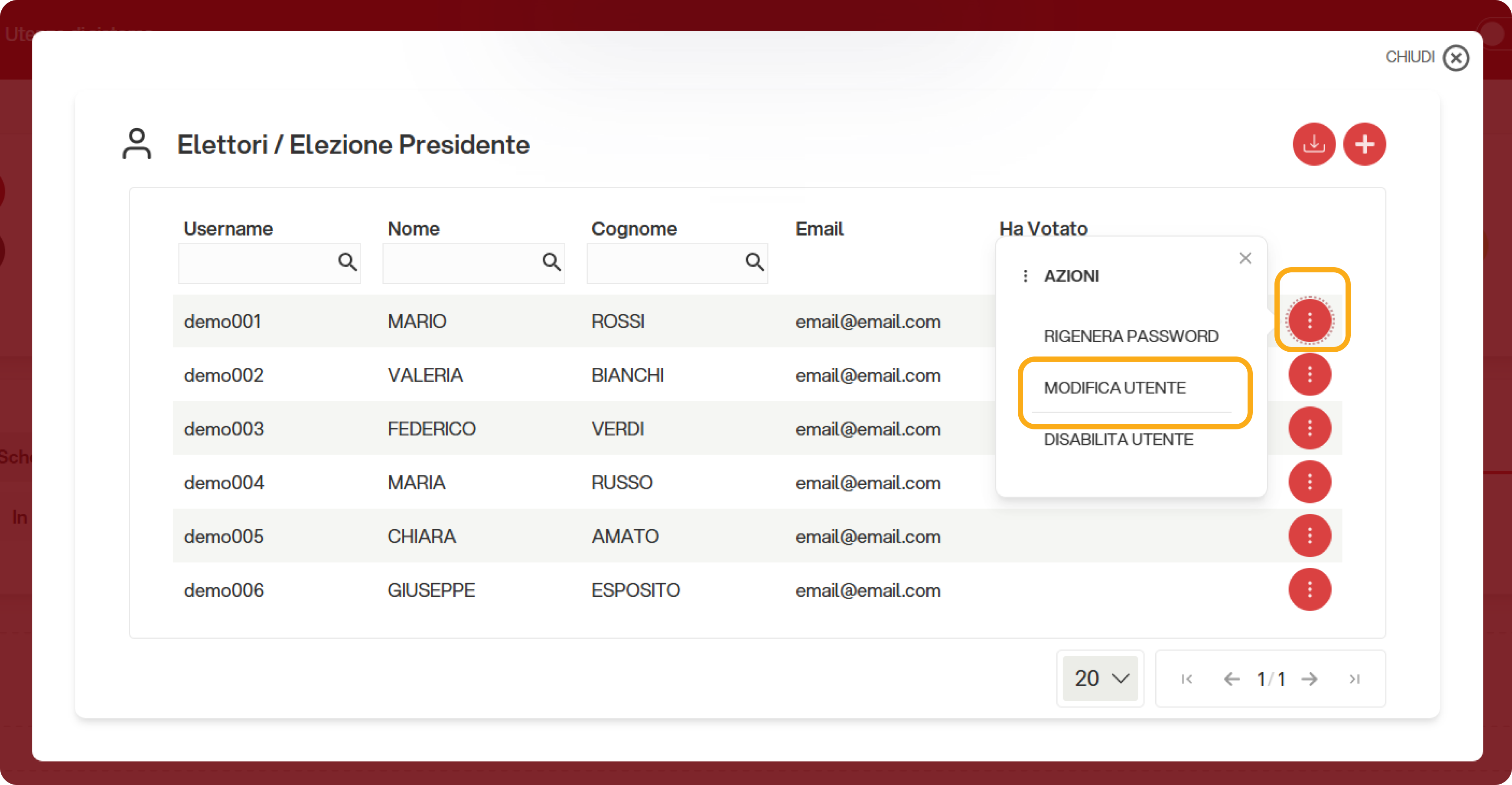 a lato dell'elettore che si desidera modificare. Si aprirà il menù a tendina con le azioni disponibili. Selezionare "Modifica utente"