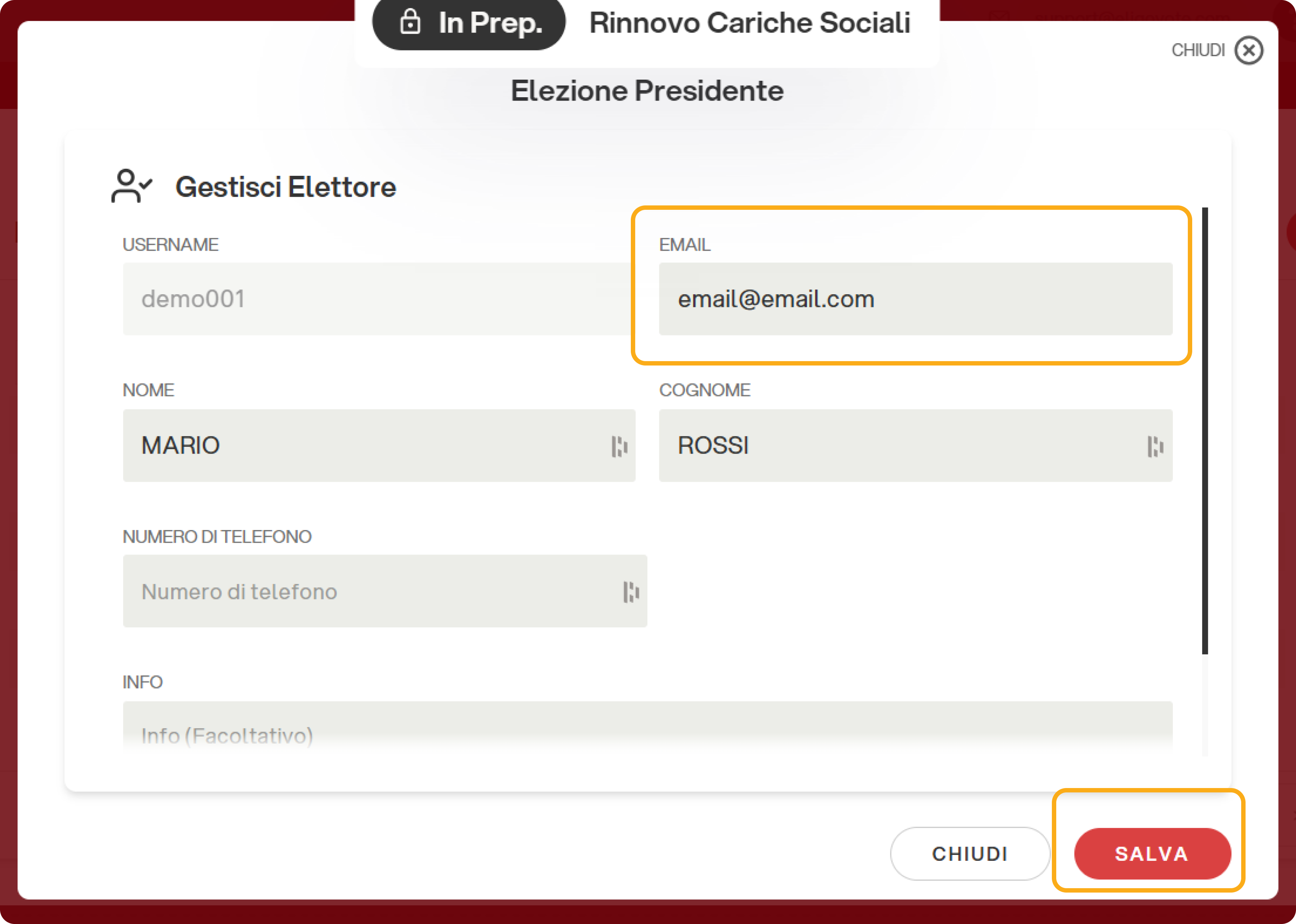 Si aprirà l'editor per modificare i dati dell'elettore. Digitare il nuovo indirizzo email e cliccare su "Salva".
