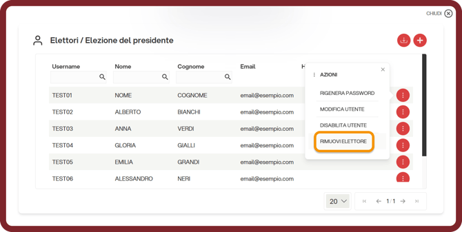 Individuare l'elettore, quindi cliccare su "rimuovi elettore":
