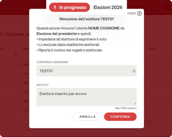 Se dovesse essere necessario aggiungere nuovamente lo stesso elettore, bisognerà farlo tramite l'aggiunta manuale. In tal caso, nei report finali sarà comunque visibile la nota sulla rimozione.È possibile rimuovere un elettore solo se: