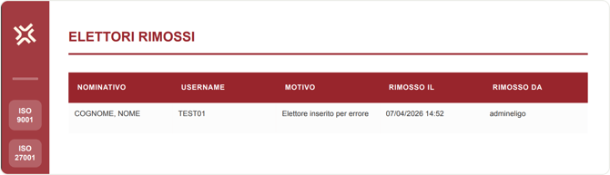 A votazioni concluse, eventuali elettori rimossi saranno riportati nel report elettori e nel file di scrutinio Excel, in una sezione dedicata.