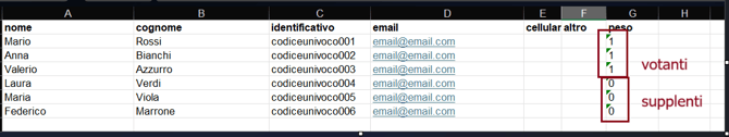 Agli aventi diritto effettivi, si associa il valore 1 nella colonna "PESO" mentre ai supplenti si associa il valore 0.