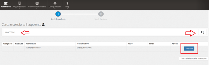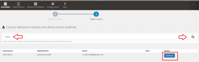 Clicca su "Seleziona" e ricerca il votante da sostituire e clicca nuovamente su "Seleziona" per confermare la supplenza: