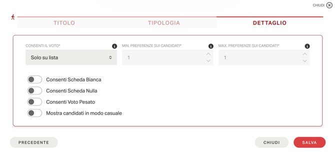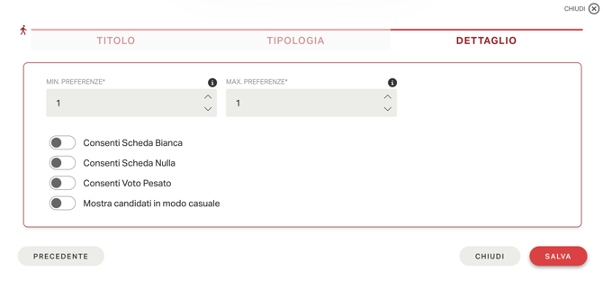Nel caso di una votazione di tipologia "Elezione di candidati", nella sezione DETTAGLIO della finestra di configurazione, è possibile configurare il numero di preferenze e l'abilitazione di Scheda Bianca e/o Scheda Nulla.