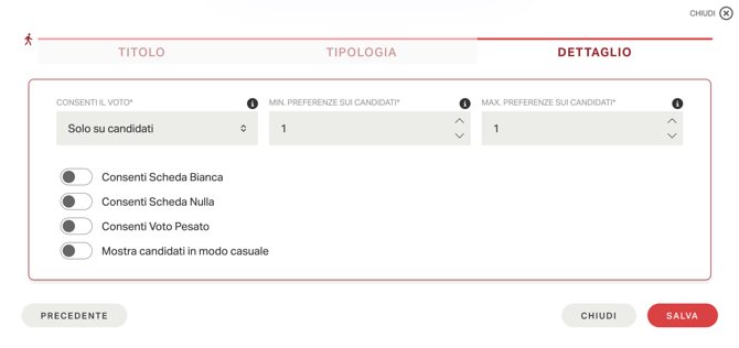 1) Nella sezione DETTAGLIO delle votazioni Solo su candidati, è possibile selezionare il numero di preferenze e l'abilitazione di Scheda Bianca e/o Scheda Nulla.