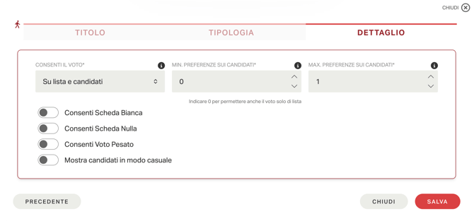3) Nella sezione DETTAGLIO delle votazioni Su lista e candidati, è possibile selezionare il numero di preferenze e l'abilitazione di Scheda Bianca e/o Scheda Nulla.