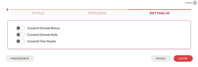 Nel caso di votazioni su proposta, nella sezione DETTAGLIO della finestra di configurazione, è possibile configurare l'abilitazione di Scheda Bianca e/o Scheda Nulla, in aggiunta alle opzioni di voto che verranno aggiunte in seguito.
