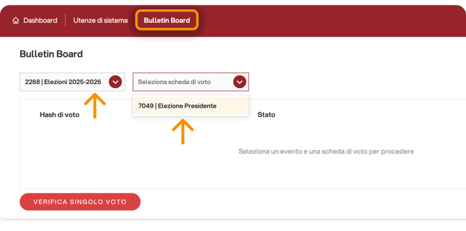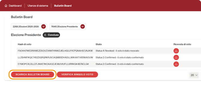 Dal menù del backoffice sarà visibile la voce "BULLETIN BOARD", che mostra gli hash di voto per ogni scheda di voto.