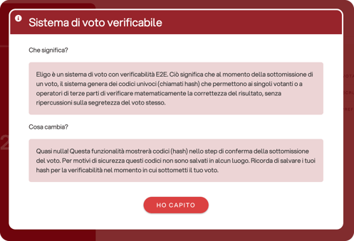 Al momento del login, verrà visualizzato un pop-up informativo che avvisa che è attiva la verificabilità del voto. Basterà cliccare su "Ho capito":