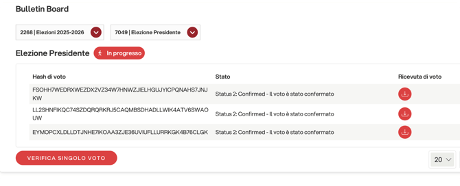 Sarà possibile scaricare la ricevuta di ogni voto, sia potendo copiare l'hash, oppure scaricando un file in formato .json. Dopodichè, è possibile verificare il singolo voto cliccando sul pulsante apposito, e poi incollando la stringa o trascinando il file .json nel box apposito: