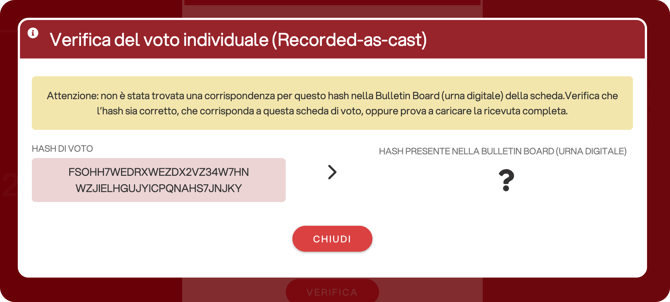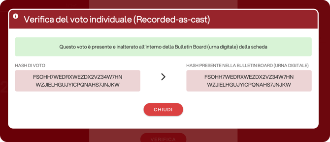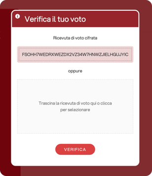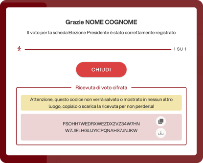 Nel momento in cui il voto viene confermato, verrà consegnata la ricevuta di voto cifrata (l'hash di voto).