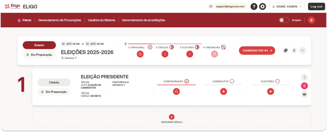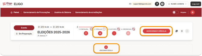No painel do tenant, é possível adicionar uma cédula de voto na seção dedicada da janela de criação do evento eleitoral ou clicando indistintamente no botão "+ Cédulas de voto" na seção de resumo do evento eleitoral; no botão "+ Adicionar cédula" posto abaixo do evento; no botão "Adicionar cédula", se houver, à direita do evento: