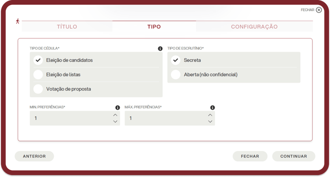 Na segunda seção, é possível escolher o tipo da votação, o tipo de escrutínio e o número de preferéncias. A votação aberta mostrará claramente as preferências expressas pelos eleitores no relatório do escrutínio.