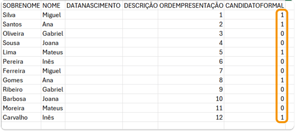 Preencha a planilha Excel de candidatos, inserindo todos os dados solicitados. No campo “Candidatura formal”, insira 1 se o candidato deve ser visível na lista e 0 para os elegíveis que não devem ser visíveis.