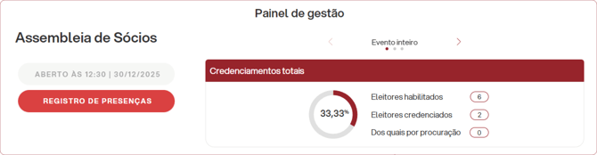 Assim, sempre que um eleitor acessar o sistema e entrar no evento, o contador de presenças será atualizado, incluindo eventuais procurações, permitindo verificar o atingimento do quórum de instalação.