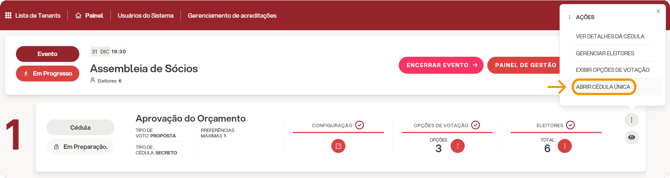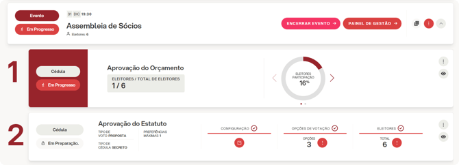 Em um evento assemblear, as votações são gerenciadas no nível da cédula. Para abri-las, é necessário clicar no ícone