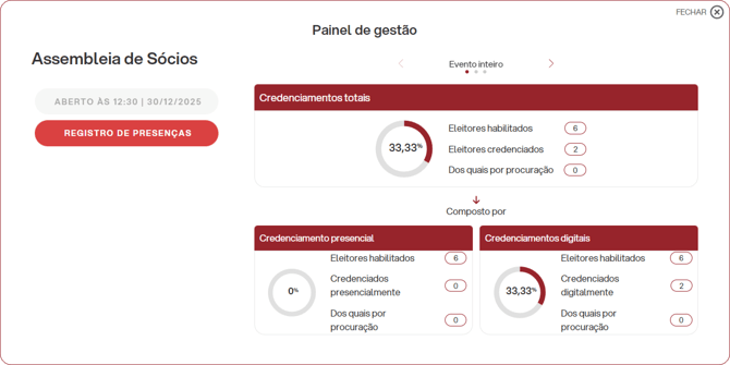 Graças ao painel de gestão, o organizador tem sempre a situação sob controle em tempo real: o sistema exibe dois contadores distintos - um para os credenciamentos presenciais e outro para os acessos online - cuja soma fornece o dado total necessário para o cálculo imediato do quórum constitutivo, exibido no contador de credenciamentos totais.