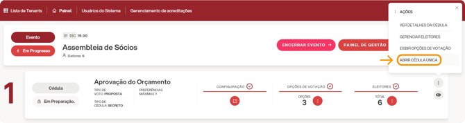 Em um evento assemblear, as votações são gerenciadas por cédula. Para abri-las, é necessário clicar no ícone