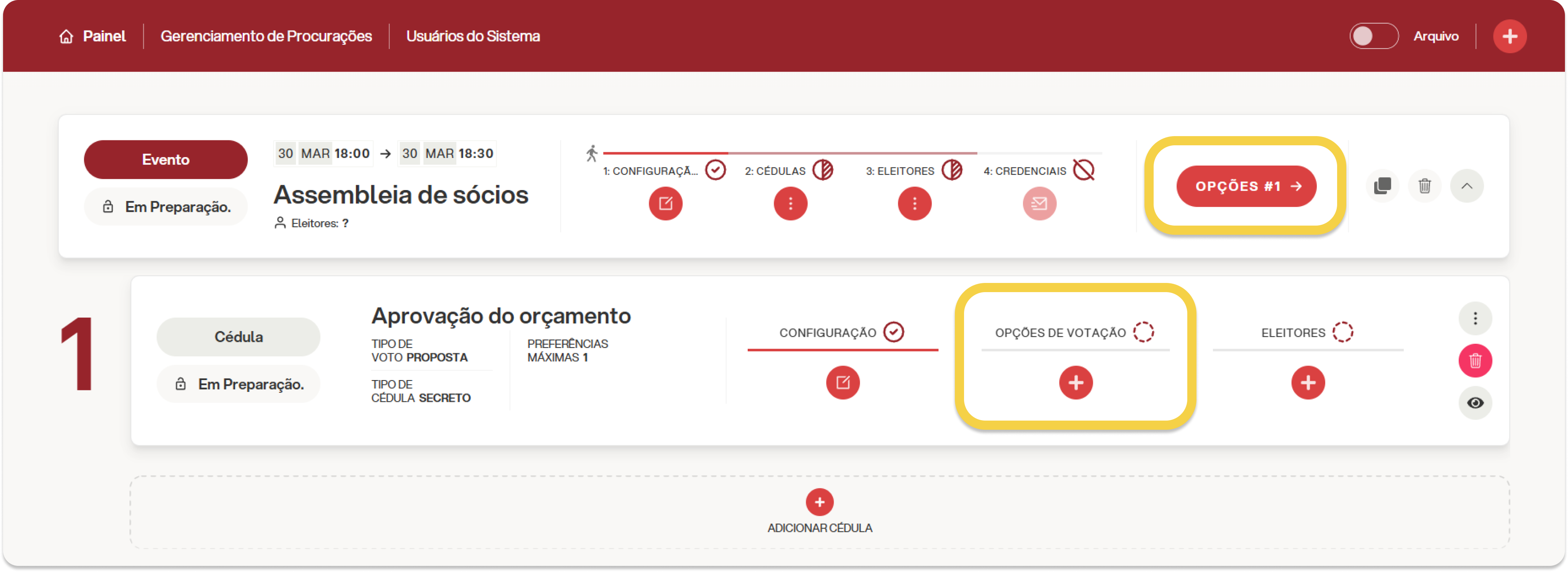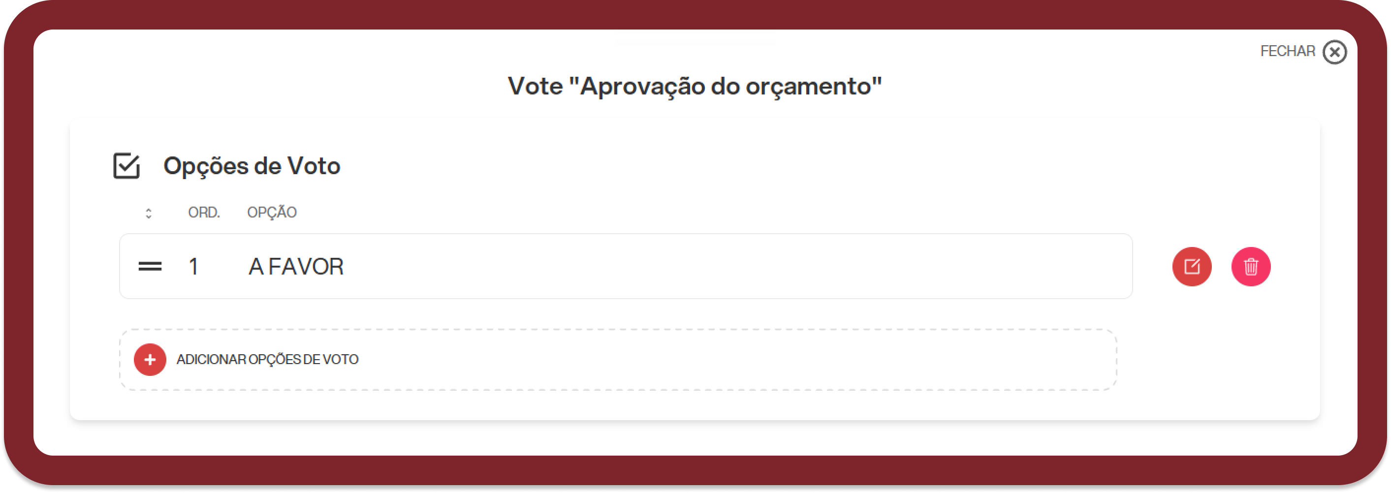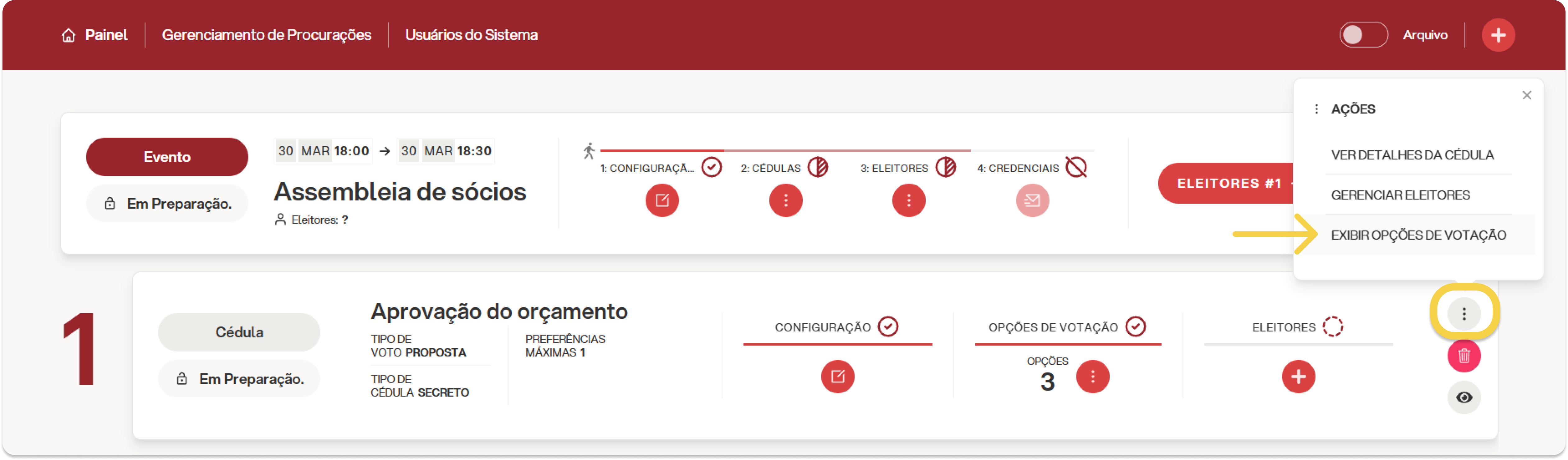 Ou clicando em "Gerenciar opções de votação" no menu correspondente na cédula de votação: