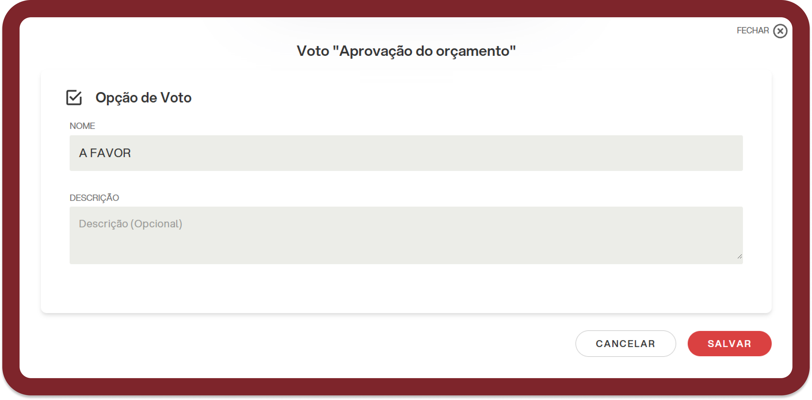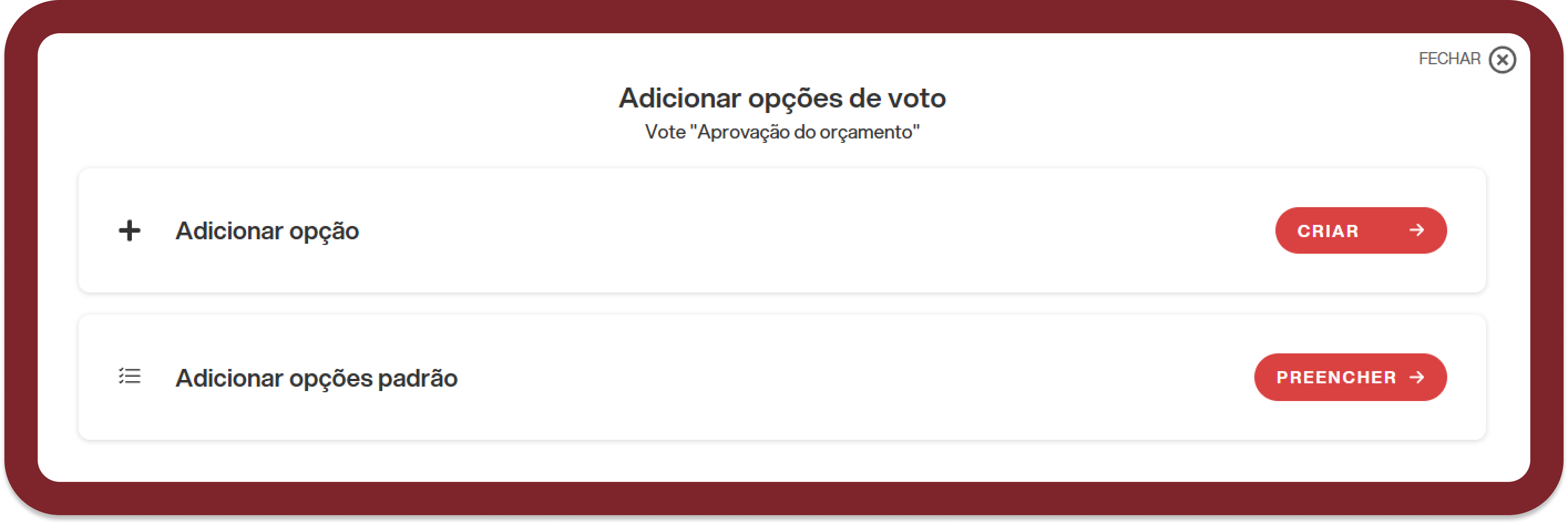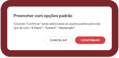 Uma vez que um dos botões tenha sido pressionado, a janela de entrada de opção será aberta, na qual será possível escolher se inserir opções personalizadas manualmente ("Adicionar opção") ou as opções padrão (A favor, Contra, Abstenção):