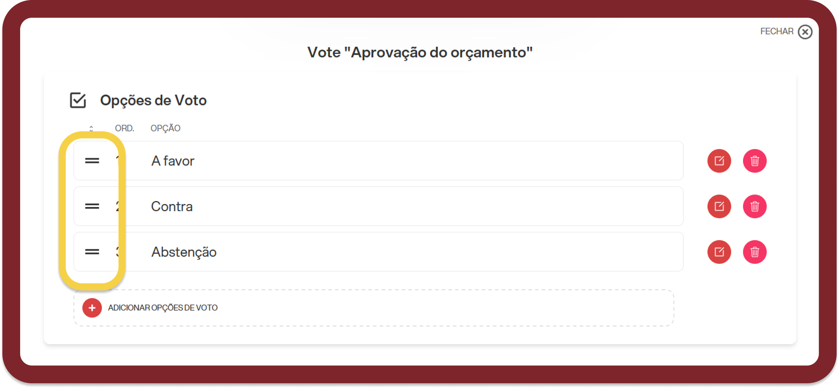 Para alterar a ordem, na janela de opções de votação, clicar no símbolo = e arrastar as opções para as posições desejadas.