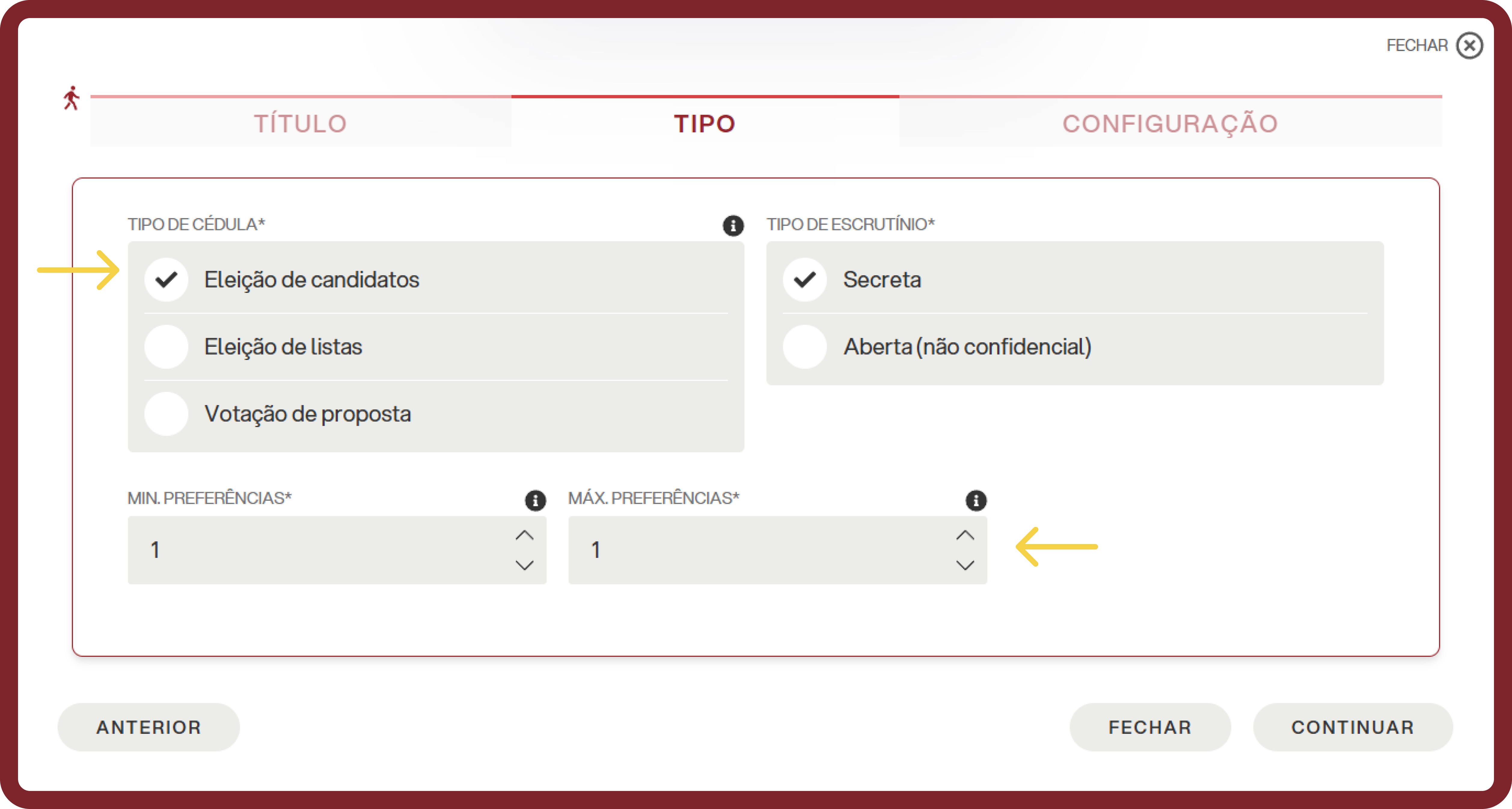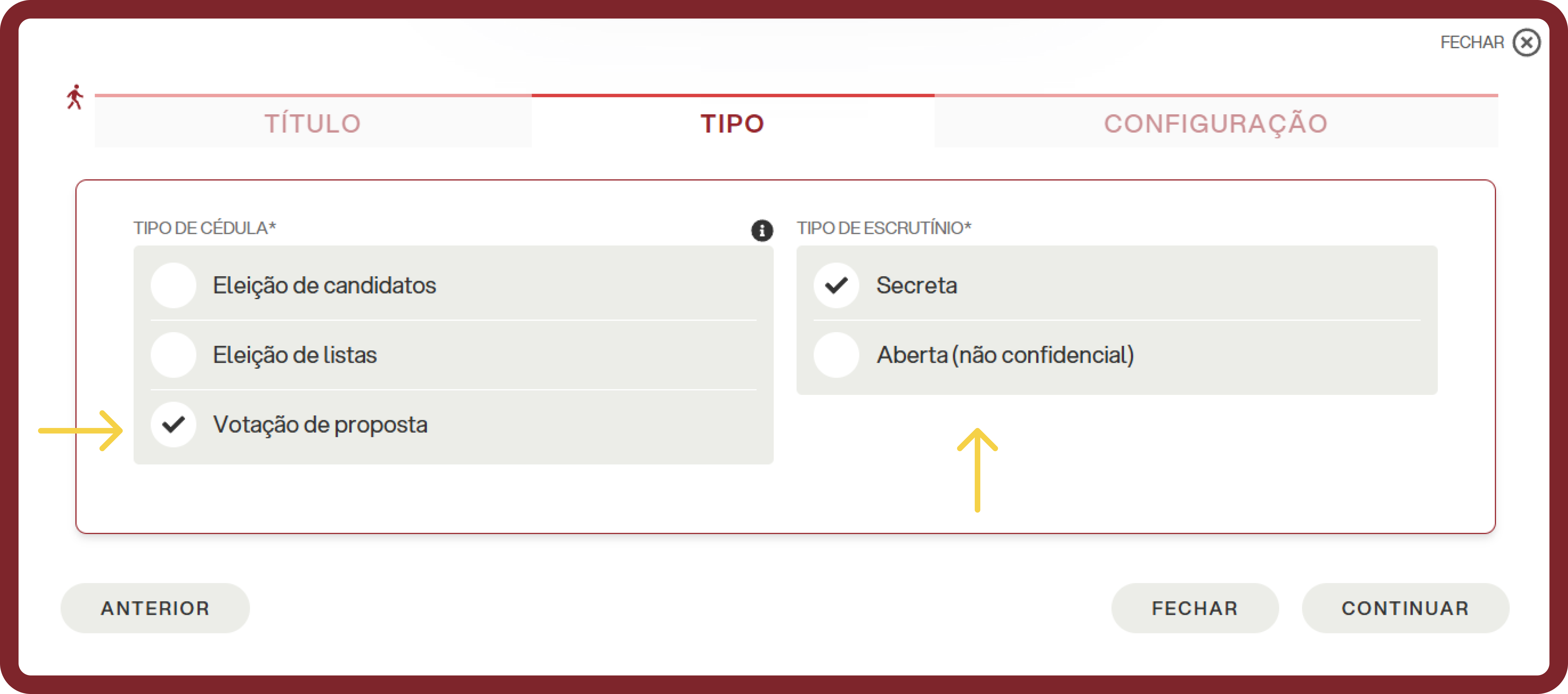 Para configurá-lo, na seção TIPOLOGIA basta selecionar o tipo de votação e o tipo de apuração.