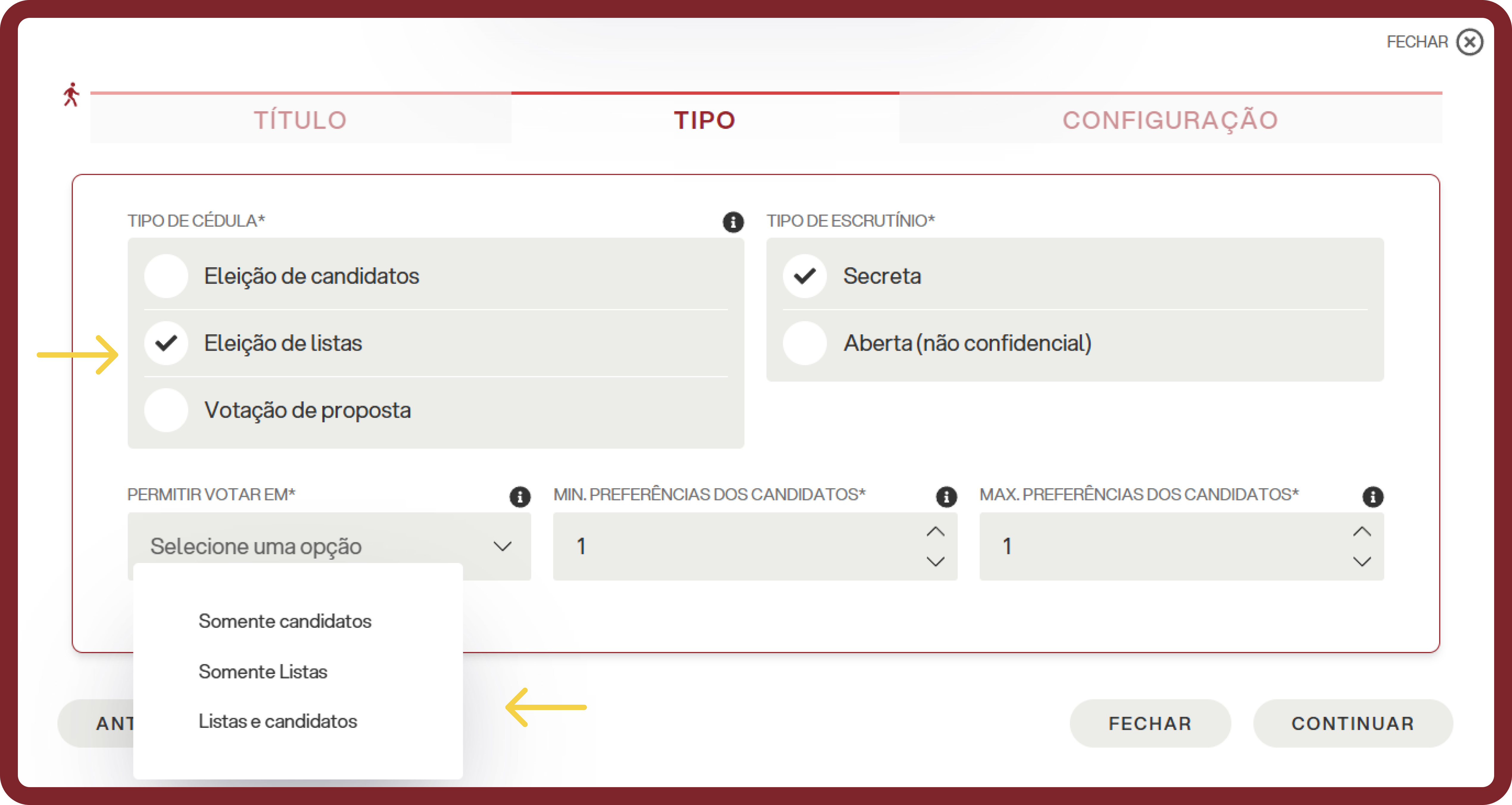 No caso de uma votação do tipo "eleição por listas", na segunda seção se deve configurar a opção de votação, escolhendo entre
